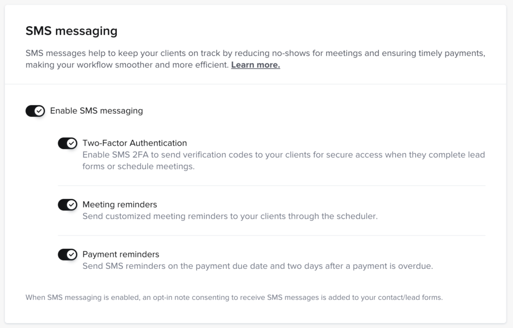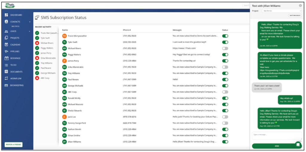 17hats makes that easy with a built-in opt-in page showing which leads/clients are opted into text messaging, and helps you manage your list if/when your contacts ask you to add or remove them manually.