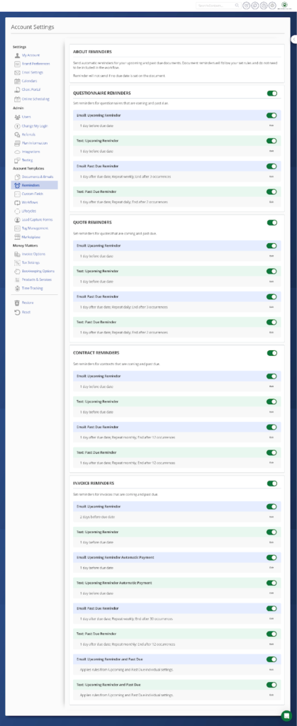 - Upcoming and past due reminders for multiple document types (invoices, quotes, contracts, and questionnaires)