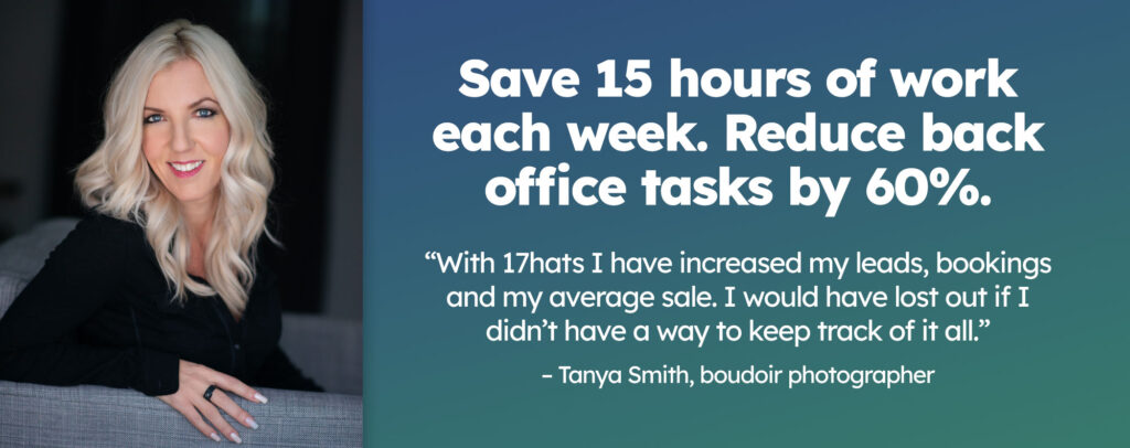 Whether you’re juggling weddings every weekend or managing a steady flow of portrait clients, 17hats becomes the reliable backbone that supports your brand — and helps it grow.