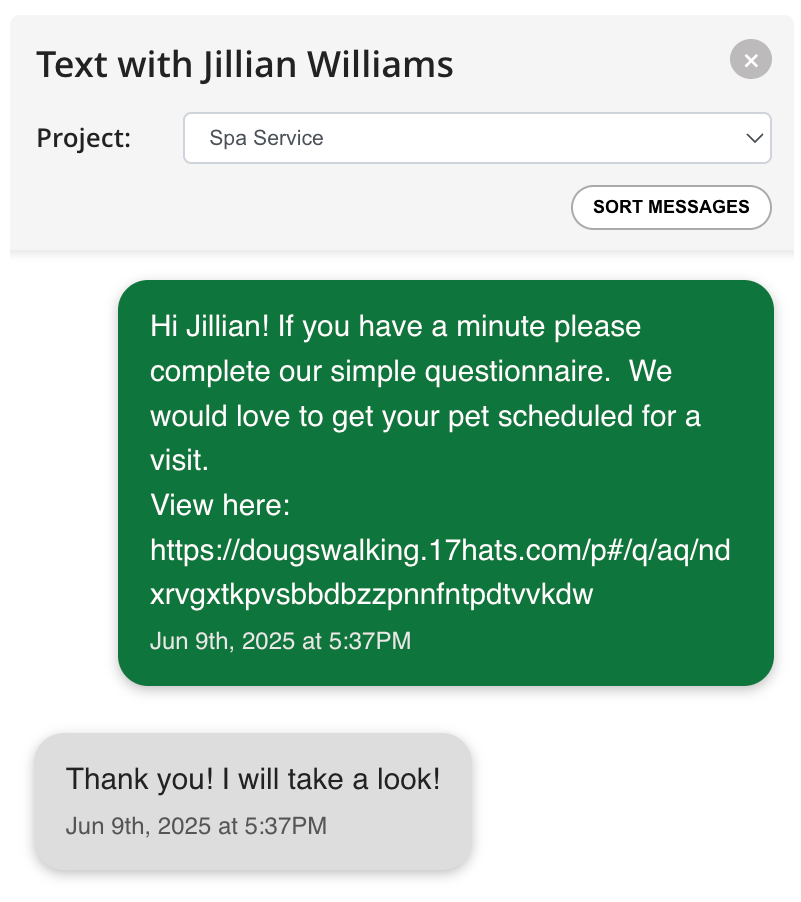 17hats channels all of those responses straight onto your Project Page, SMS Status Page, and even your Dashboard, allowing you to write in a custom reply instantly. Quick, natural conversations do what long emails can’t — they build trust quickly.